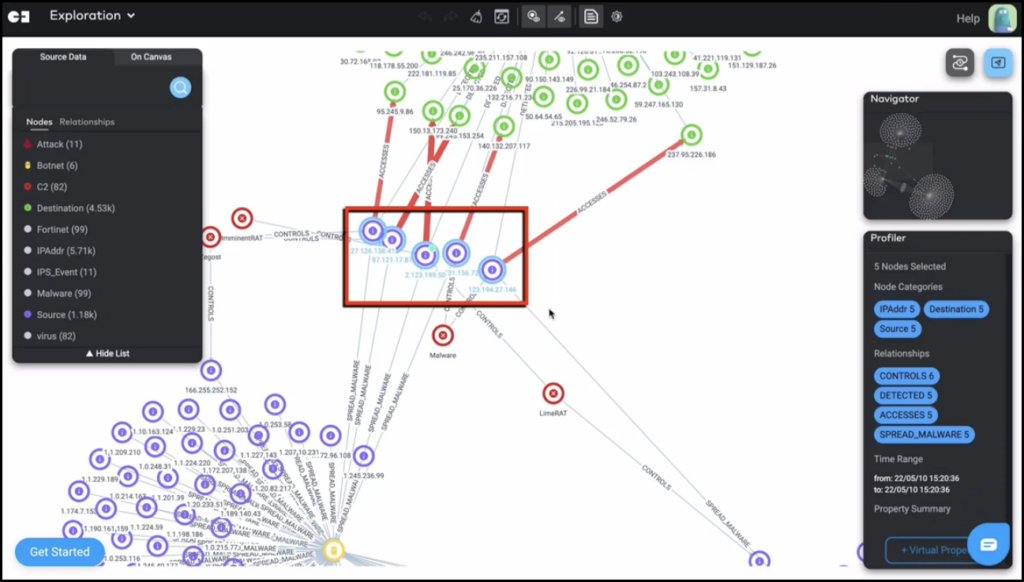 A security team at a Fortune 500 firm is investigating an attack on their network. Graphing the data set reveals several botnets with malware and attacks clustered among various IP addresses.